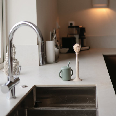 El cepillo de silicona para biberones Mushie está diseñado para los padres que priorizan la limpieza y la comodidad en la rutina de alimentación de su pequeño.