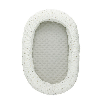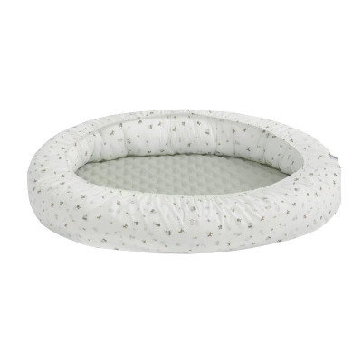 El cojín está relleno de fibras huecas para la máxima adaptación y la base, lleva una colchoneta plastificada para poder gastarlo luego como cambiador. Se puede lavar todo el textil en lavadora y secadora.