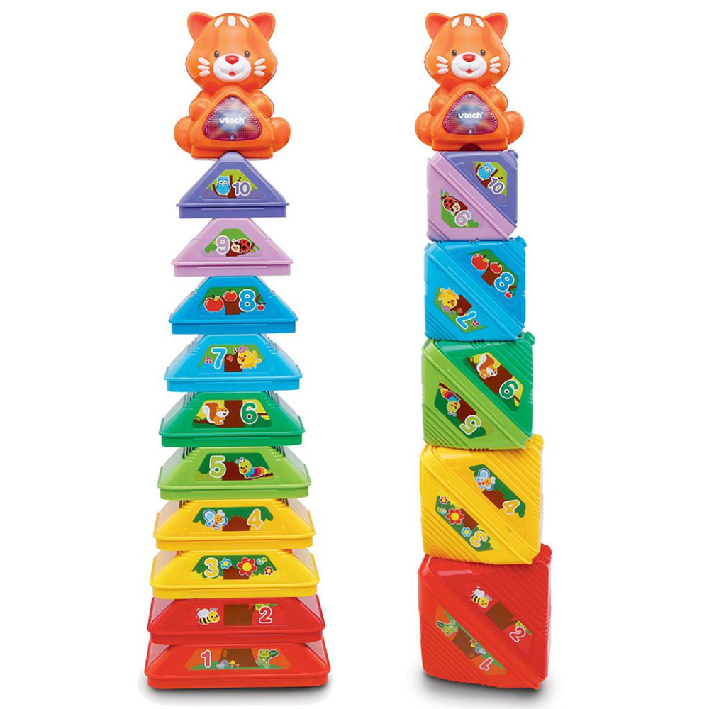 - 11 piezas para manipular: 10 bloques triangulares de colores y el gato con voz y luz