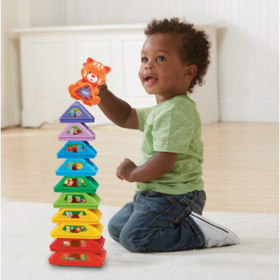 - El bebé se divierte apilando los 10 bloques con forma de triángulo para formar una pirámide gigante