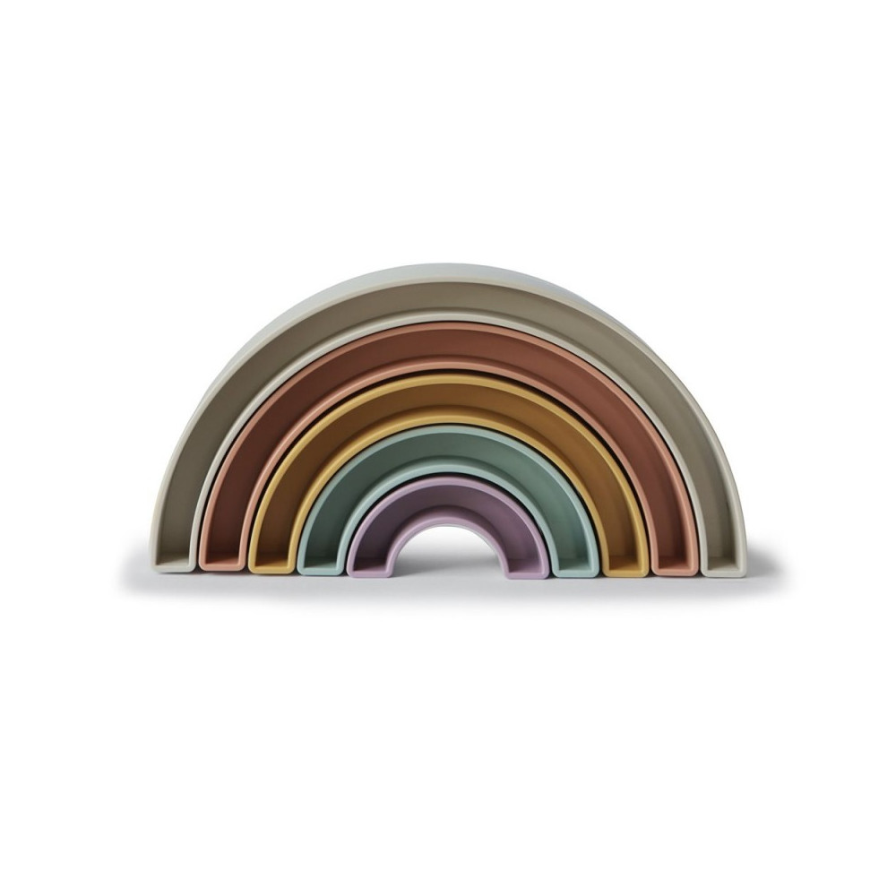 ¡Un hermoso y divertido arcoíris apilable en varios colores de Mushie!