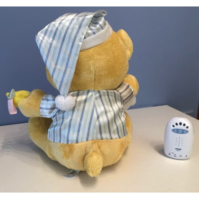 Un hermoso peluche con actividades que también funciona como receptor para el intercomunicador. Tu bebé juega con el tierno osito mientras tú estás tranquil@ escuchando en la unidad de padres lo que está sucediendo.