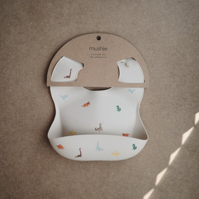 La colección de baberos de silicona de Mushie es divertida, atemporal y colorida en varios diseños.