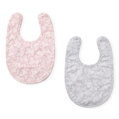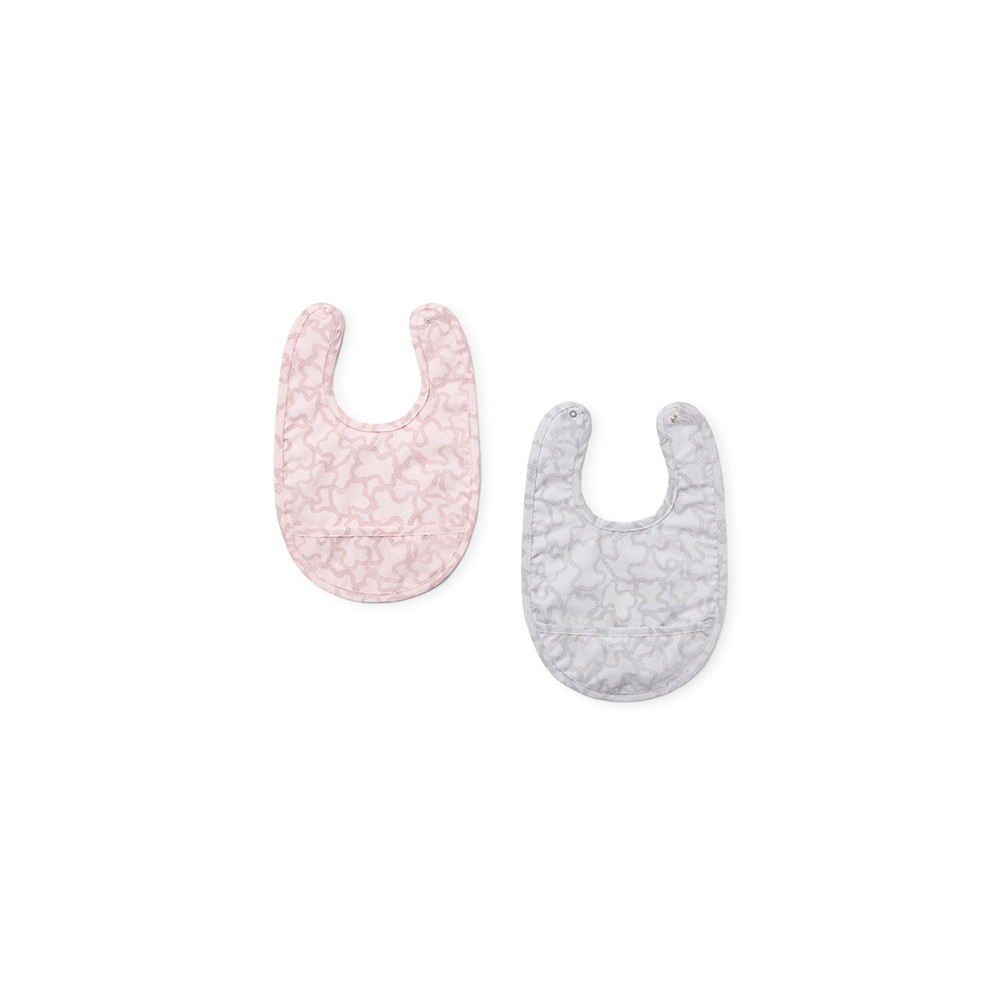 Set Tous Baby de dos baberos con interior plastificado. Estampados de la colección Kaos en dos colores. Sujeción trasera con botón de presión en la parte posterior. Fabricado en UE.