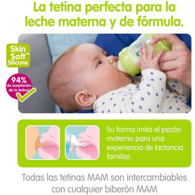 Forma simétrica y plana exclusiva: como el pecho de la madre durante la lactancia. Con superficie de silicona suave y sedosa para una sensación familiar. El 94 % de los bebés acepta la tetina del biberón Mam*.