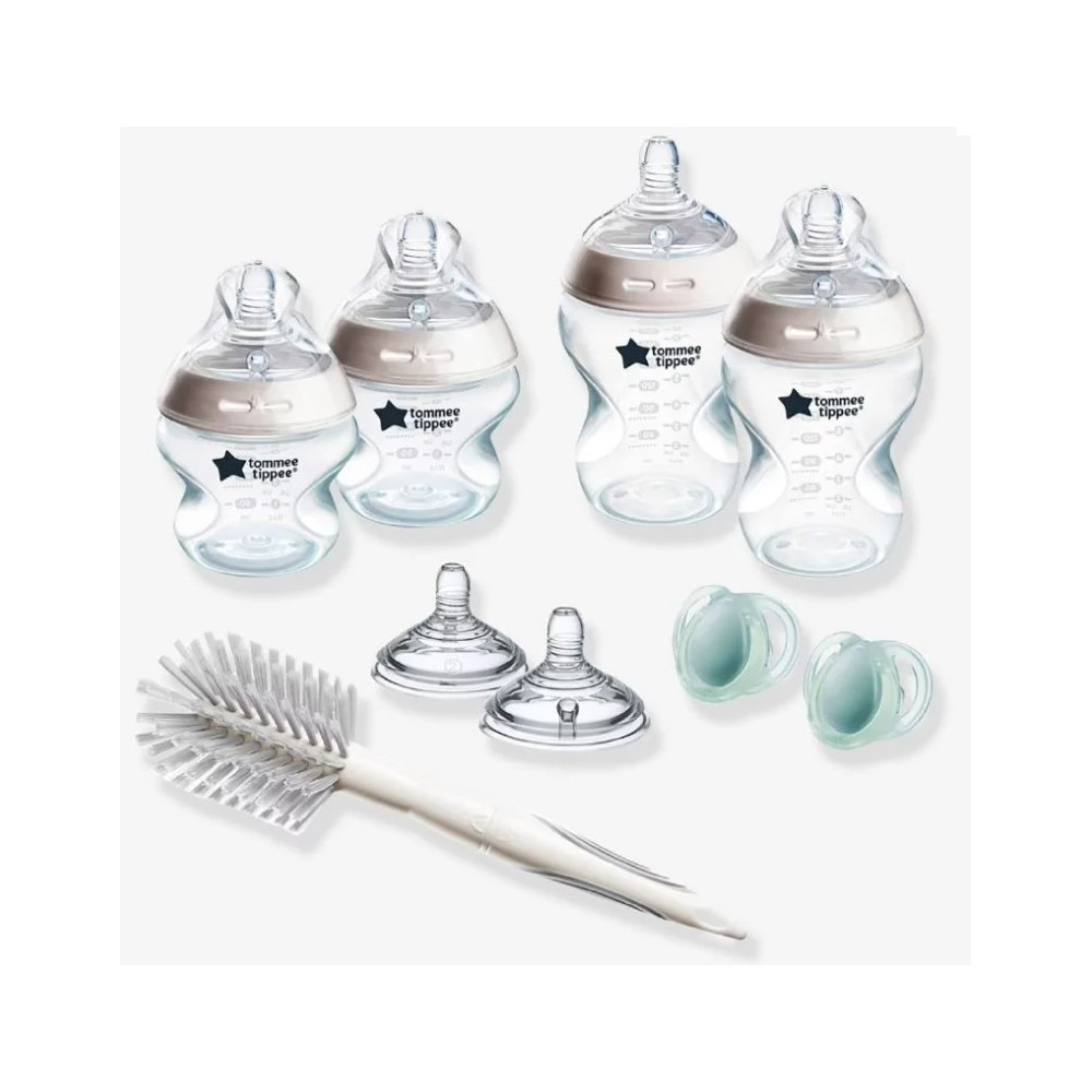 El kit de iniciación para recién nacidos contiene lo necesario para los primeros meses del bebé, como biberones de diferente tamaño, tetinas, un cepillo para la limpieza de biberones y tetinas, y chupetes aptos desde los 0 hasta los 6 meses.