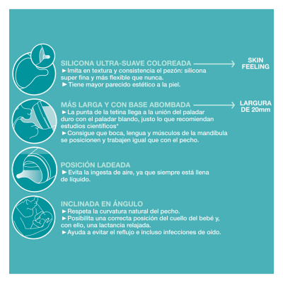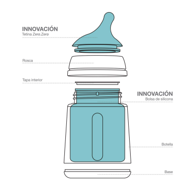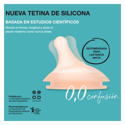 La tetina del biberón Zero Zero es de silicona fina ultra suave, simulando en forma, longitud y tacto el pezón materno para minimizar la confusión entre tetina y pezón. De esta forma, el bebé de lactancia mixta vuelve fácilmente al pecho sin rechazarlo y el bebé de lactancia con biberón acepta la tetina de forma más natural.