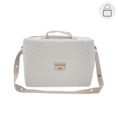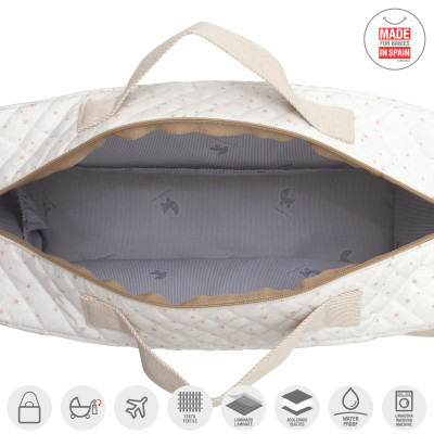 Bolso maternal de la colección Astri. Este bolso en color blanco tiene un estampado de estrellitas en rosa con detalles en beige ideal para darle color a esta preciosa colección. Puedes colgarlo en tu cochecito de bebe gracias a sus corchetes y también podrás colgártelo del hombro.