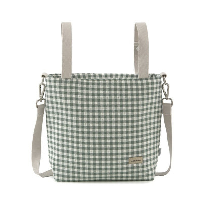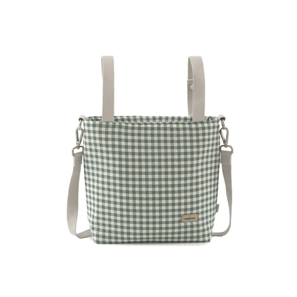 El bolso Talega de Cambrass, está diseñado con medidas perfectas, tanto para el trasporte en el carro como para la mama, este bolso lleva 2 asas que se abrochan con clips para poder colgarlo en el carro, y un asa bandolera, para que la mama se lo pueda colgar del hombro.