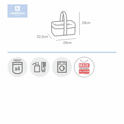 La cesta canastilla acolchada de Cambrass, disponible en todos los coordinados de la colección Cambrass, sirve para guardar los artículos de higiene del bebé (colonia, peine, jabón& ).