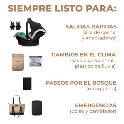 Accesorios incluidos: bolsa, cambiador, adaptadores, cubrepiés, plástico impermeable, mosquitera, colchón para el capazo