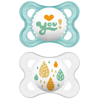 Disponible como chupete de silicona MAM SkinSoft™ o chupete de caucho natural