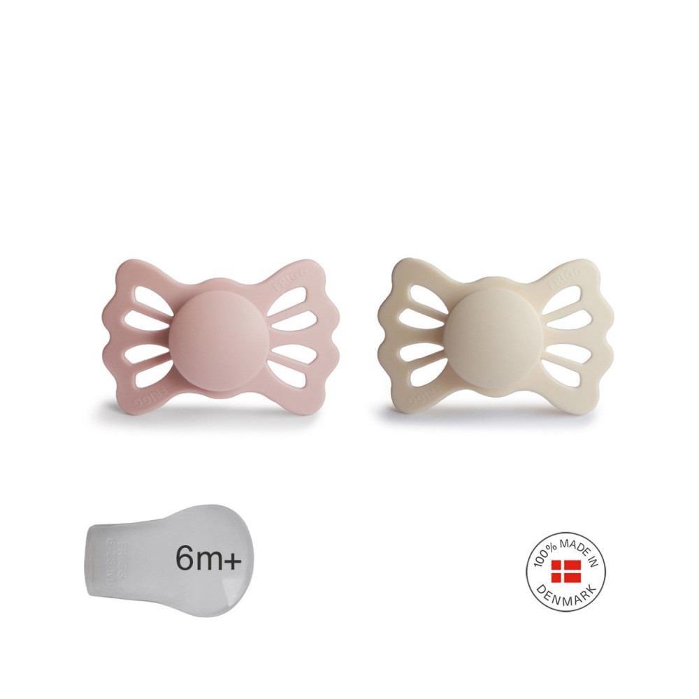 FRIGG Lucky es un chupete simétrico con una tetina ligeramente aplanada y en forma de lágrima. El chupete simétrico siempre encaja correctamente en la boca del bebé, independientemente de si está orientado hacia arriba o hacia abajo. El chupete está diseñado con un cuello más plano para reducir la presión sobre el paladar, las encías y también reducir el riesgo de dientes torcidos y una mordida torcida. El diseño ortodóntico es perfecto para favorecer el correcto desarrollo de los dientes, la mandíbula y el paladar del bebé.