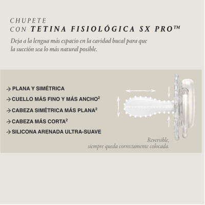 La tetina fisiológica SX Pro es lo más parecido a no llevar chupete y ha sido diseñada para respetar el desarrollo bu Ver más...