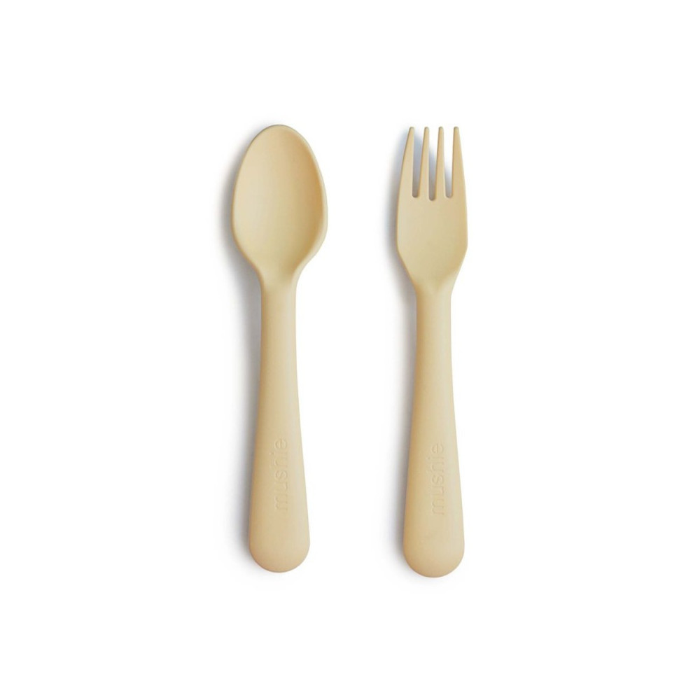 ¡Introduce a tu bebé en la comida sólida con el juego de tenedor y cuchara de plástico de Mushie!