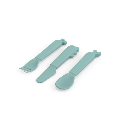 El precioso juego de cubiertos azul tiene una cuchara con orejas de Lalee, un tenedor con orejas de Raffi y un cuchillo con las escamas de Croco. Los cubiertos tienen una superficie mate sedosa y combinan con el resto de la colección Kiddish.