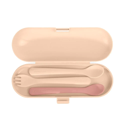 Set de cubiertos anatómicos evolutivos con estuche protector. Contiene 2 cucharas, una blandita y otra más dura de diferentes capacidades y un tenedor de puntas redondeadas, todos aptos para un contacto seguro con las encías de tu bebé.