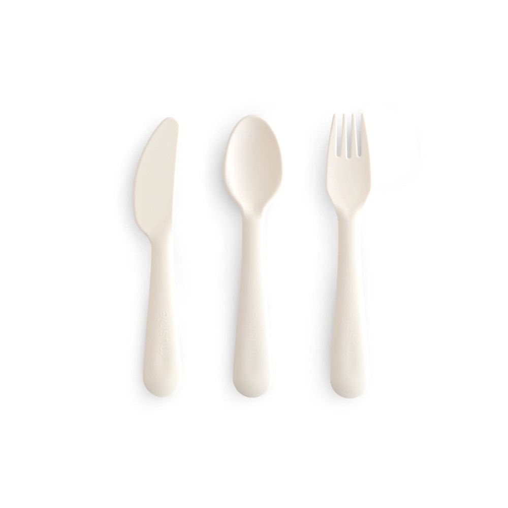 Un elegante y práctico juego de cubiertos de plástico PP de Mushie, diseñado pensando en los más pequeños.