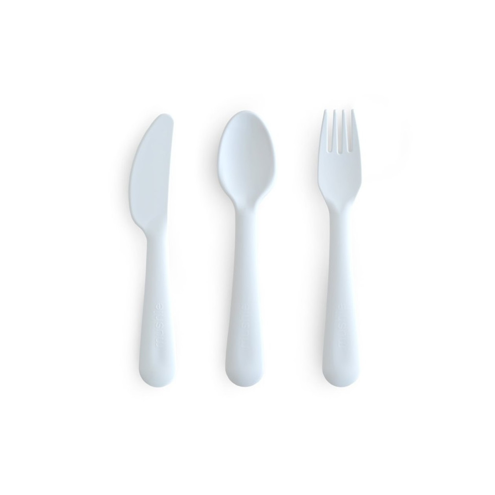 Un elegante y práctico juego de cubiertos de plástico PP de Mushie, diseñado pensando en los más pequeños.