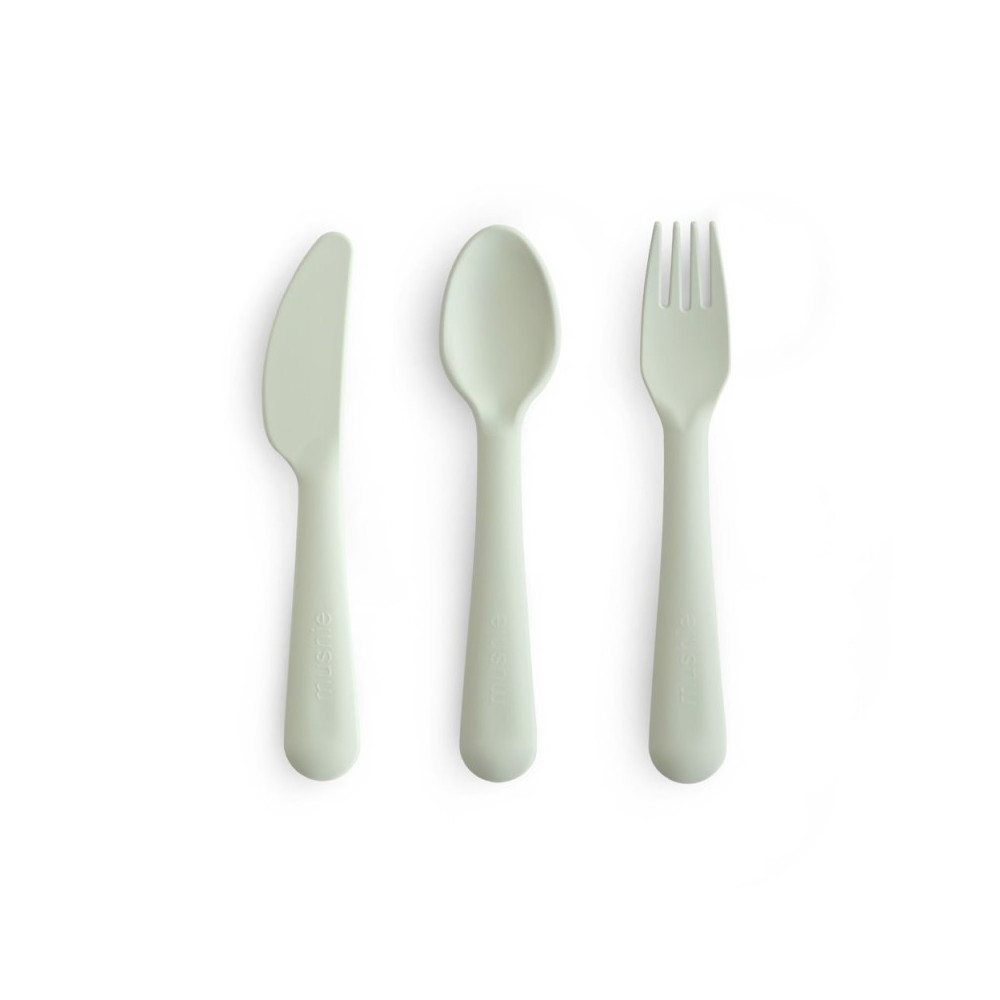 Un elegante y práctico juego de cubiertos de plástico PP de Mushie, diseñado pensando en los más pequeños.