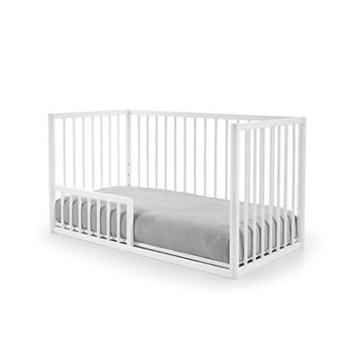 Fabricada en madera noble de haya, Tesori se transforma fácilmente de cuna a cama Montessori, parque y opción de colecho, adaptándose a vuestras necesidades cambiantes.