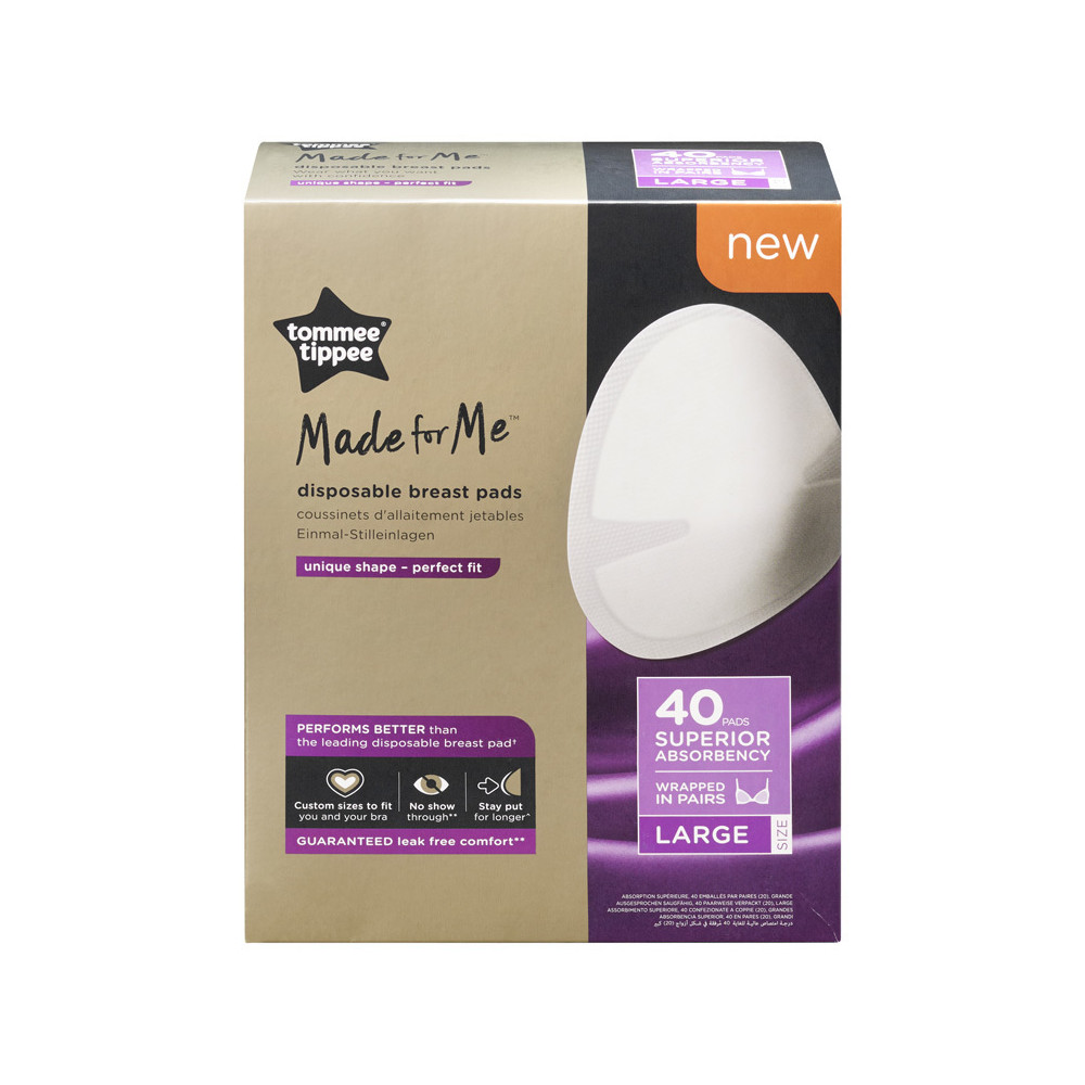 Los discretos discos absorbentes desechables Made for Me de Tommee Tippee ofrecen mayor comodidad y rendimiento que otros discos absorbentes líderes del mercado*, gracias a su forma única, a sus cinco capas y a sus dos tamaños, para adaptarse mejor a ti y a tu sujetador.
