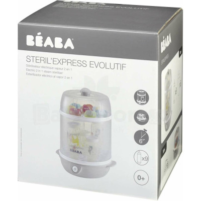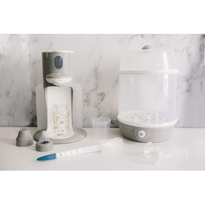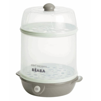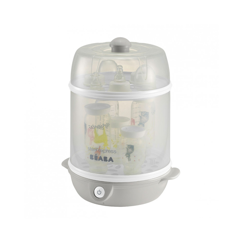 El esterilizador eléctrico de vapor es eficaz y destruye el 99,9% de las bacterias. La separación permite esterilizar hasta 9 biberones de cuello estrecho y 6 de cuello ancho en modo Maxi y tubos pequeños en modo Mini.