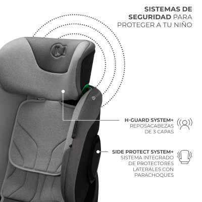 El sistema H-GUARD+ es un reposacabezas reforzado especial de 3 capas con espuma viscoelástica añadida. Gracias a su estructura, el reposacabezas de la silla protege aún mejor la cabeza y las cervicales del niño, puesto que absorbe la energía generada por el impacto sin impedir que afecte al pequeño pasajero. Por otro lado, la espuma adicional aumenta la comodidad durante el viaje.