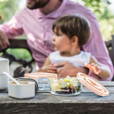 Este conjunto eco-friendly, está formado por 2 contenedores de 160 ml (solo base, sin la tapa) de vidrio, material resistente y duradero, que además al ser completamente transparente permite ver perfectamente el contenido. Los contenedores tienen el tamaño ideal para almacenar de forma separada las pequeñas porciones de comida casera del bebé, leche en polvo, fruta… y llevarlas a cualquier lugar.