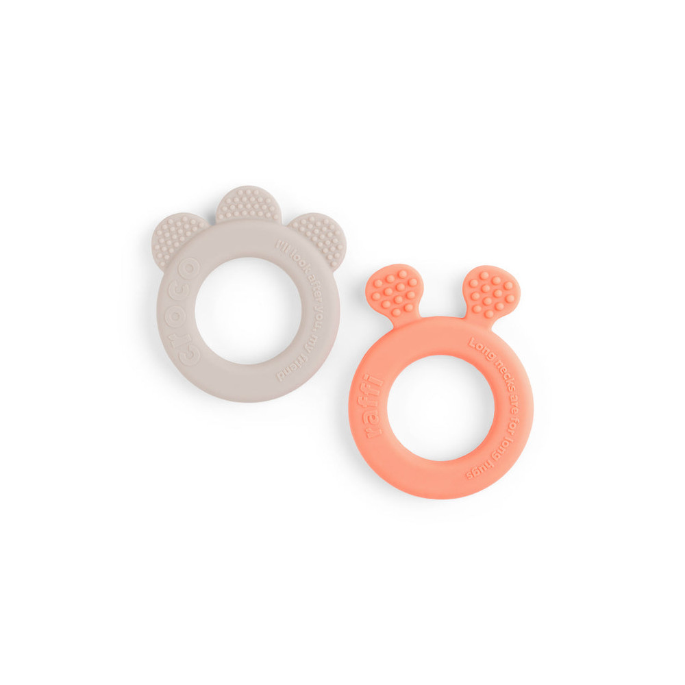 El paquete de 2 mordedores Deer Friends está en tonos arena y rojo coral.
