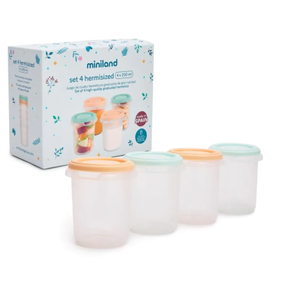 El Set de 4 Hermisized 250 ml de Miniland está compuesto por cuatro recipientes herméticos del mismo tamaño, diseñados para facilitar la conservación y organización de la alimentación del bebé. Su capacidad de 250 ml resulta adecuada para una amplia variedad de tomas y preparaciones.