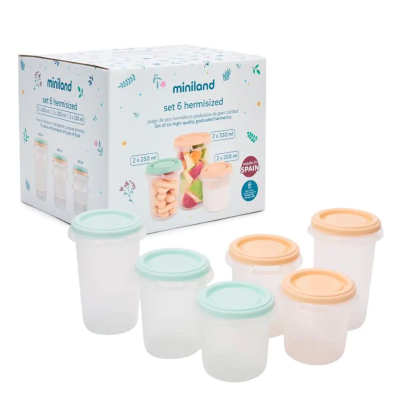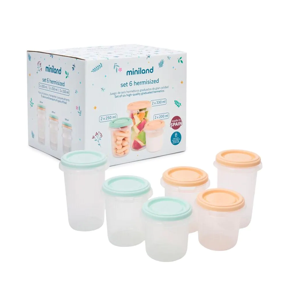 El Set de 6 Hermisized de Miniland es un conjunto de recipientes herméticos diseñado para facilitar la conservación y organización de la alimentación del bebé. Incluye seis recipientes distribuidos en tres tamaños diferentes, pensados para adaptarse a las distintas etapas y necesidades de las tomas.