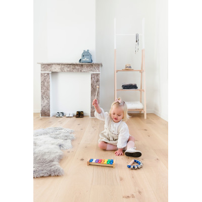 SET COMPLETO: Incluye 8 divertidos instrumentos: pandereta, claves, maracas, huevos agitados, xilófono, badajo rítmico, triángulo y campana de mano.