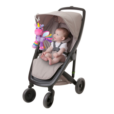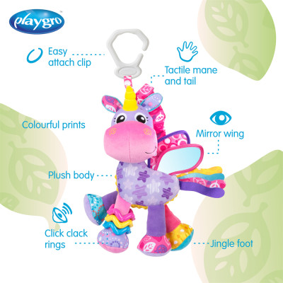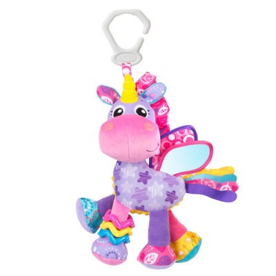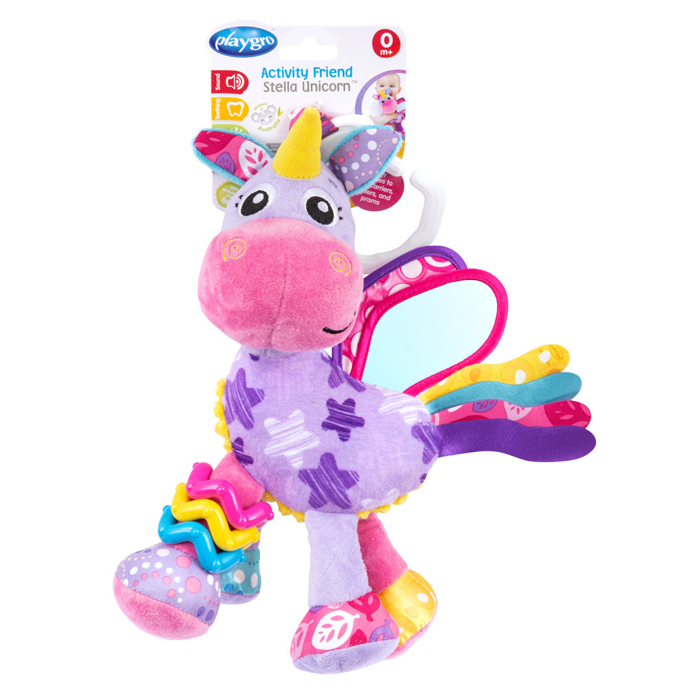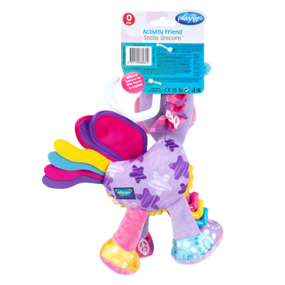 Activity Friend Stella Unicorn tiene anillo clic para colgar y dos pies arrugados para estimular las habilidades motoras finas del bebé.