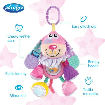 Este perro suave le enseña al bebé sobre la coordinación mano-ojo mientras fomenta el desarrollo táctil y sensorial con sonidos, formas y texturas.