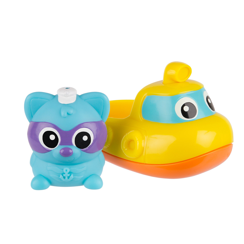El mapache cabe fácilmente en el submarino o se puede quitar para un juego prolongado. A medida que el bebé sumerge a Raccoon para llenarse de agua y suelta el sello para iniciar el flujo de agua, aprenden sobre la causa y el efecto, involucrando habilidades cognitivas y motoras finas.