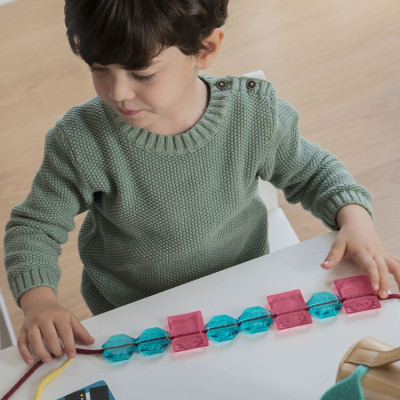 Permite jugar individualmente o de forma colectiva ya que incluye cordones coloridos y de gran grosor con el que los peques podrán formar hasta 4 collares a la vez.