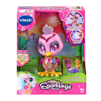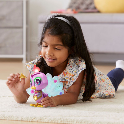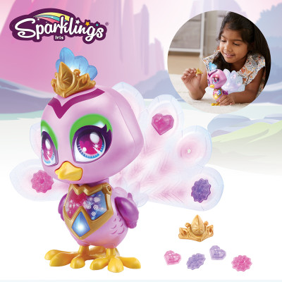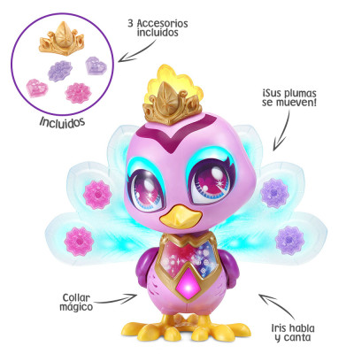 "¡Hola, soy Iris Sparkling! Ven conmigo a conocer el universo mágico de las mascotas de fantasía de VTech. Pulsa mi medallón para elegir un color y luego toca mi cresta, ojos o plumas para cambiarme el look.