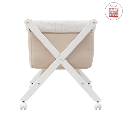 La minicuna con estructura en forma de aspa de Cambrass está fabricada en madera de haya.