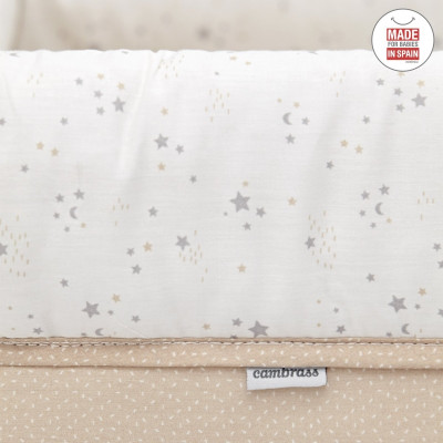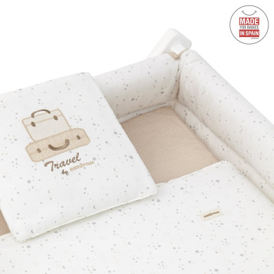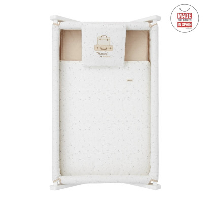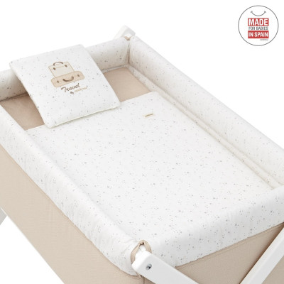 Otros aspectos que hacen especialmente funcional esta minicuna, incluye almohada, colchón y somier de madera de 5mm, soporte de madera y su vestidura cosida que incluye la colcha con relleno extraíble para su lavado o para el uso invierno / verano.