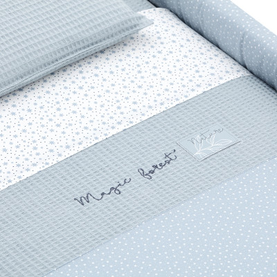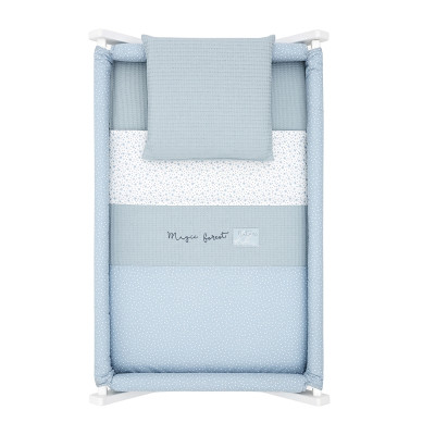 Otros aspectos que hacen especialmente funcional esta minicuna, incluye almohada, colchón y somier de madera de 5mm, soporte de madera y su vestidura cosida que incluye la colcha con relleno extraíble para su lavado o para el uso invierno / verano.