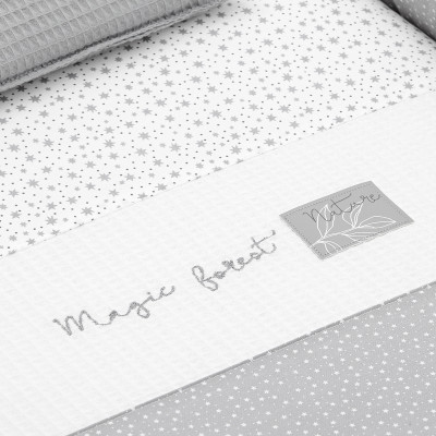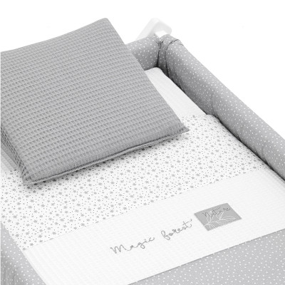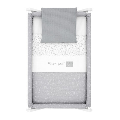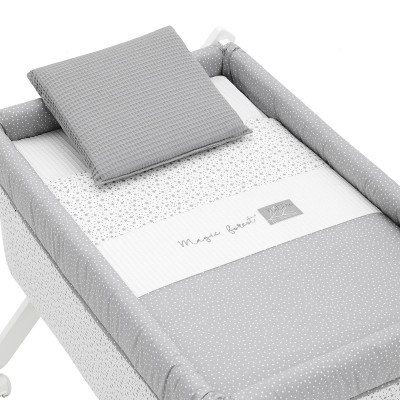 Otros aspectos que hacen especialmente funcional esta minicuna, incluye almohada, colchón y somier de madera de 5mm, soporte de madera y su vestidura cosida que incluye la colcha con relleno extraíble para su lavado o para el uso invierno / verano.