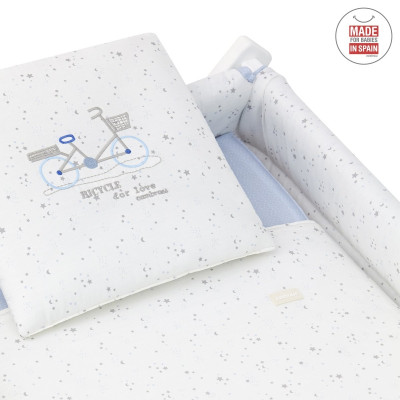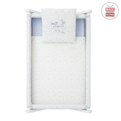 Otros aspectos que hacen especialmente funcional esta minicuna, incluye almohada, colchón y somier de madera de 5mm, soporte de madera y su vestidura cosida que incluye la colcha con relleno extraíble para su lavado o para el uso invierno / verano.