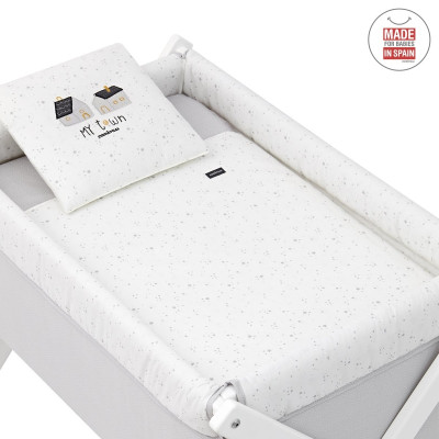 Otros aspectos que hacen especialmente funcional esta minicuna, incluye almohada, colchón y somier de madera de 5mm, soporte de madera y su vestidura cosida que incluye la colcha con relleno extraíble para su lavado o para el uso invierno / verano.