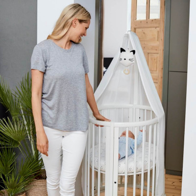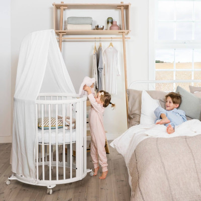 El mástil y el dosel hacen que sea un complemento realmente elegante para cualquier habitación infantil. Las ruedas giratorias bloqueables permiten mecer al bebé suavemente para dormirlo y mover la cuna de una habitación a otra.