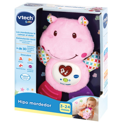 Hipo mordedor es un dulce juguete que acompañará al más pequeño en cada momento convirtiéndose en su amigo más fiel. Tiernas melodías, canciones y frases para relajar al bebé, además de dos mordedores para calmar el dolor por la salida de los primeros dientes.