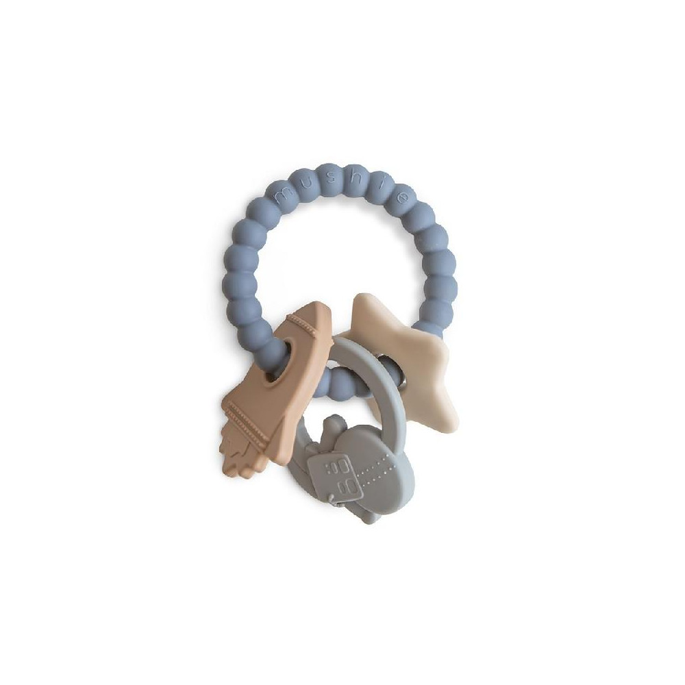 Un anillo de dentición con temática espacial; el anillo con pequeñas figuras del espacio (astronauta, estrella y cohete espacial) está diseñado para aliviar las encías doloridas y proporcionar alivio a los más pequeños y tranquilidad a los padres.