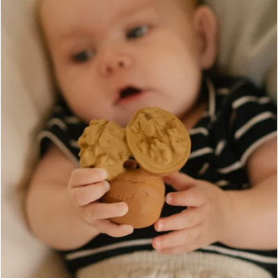 Nutty the Walnut es un mordedor, juguete de baño y juguete de juego sensorial para bebés con forma de nueces. Sus texturas estimulan sus sentidos y alivian las molestias durante la dentición. Además, su diseño con un agujero en el centro hace que sea muy fácil de colgar por un chupetero. ¡Llévalo a todas partes!