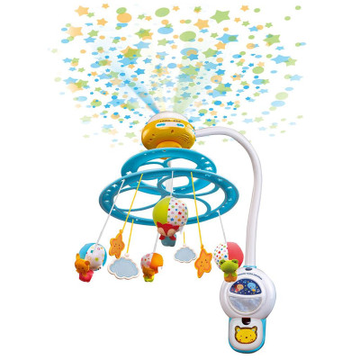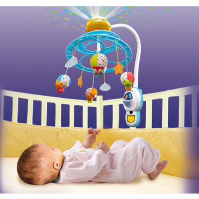 La base de la luz es desmontable y se puede utilizar también como proyector. Incluye un espejo de seguridad y sensor de sonido para activar el juguete con el llanto del bebé.