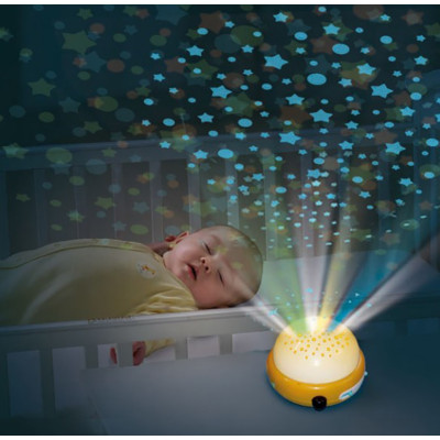 Un precioso proyector con luz de colores diferentes, 4 animalitos de suaves texturas y 3 modos de juego diferentes (Nanas, Naturaleza y Descanso) para animar al niño o ayudarle a conciliar el sueño.